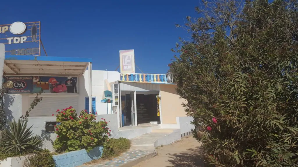 Ein freundlicher Tunesier begrüßt seine Kunden und ist dabei bereits mitten im Verkaufsgespräch. Es gibt einfach alles. Und was gerade nicht da ist, wird binnen Minuten von anders sortierten Mitbewerbern in der Nähe kurzerhand besorgt. Gummibärchen, Limonaden aller Art, Müsliriegel, Haar Shampoo und natürlich Nonfood. Sonnenbrillen, Sonnenhüte, Sonnenschutz, T-Shirts und Taschen. Selbst Kühlpflichtiges ist ausreichend vorhanden. Gekühlte Colas und Nestle Eiscreme. Das Preisniveau ist auf Touristenniveau. Aber da dies der einzige laden im Einzugsgebiet ist, bleibt er natürlich Preisleader. Ganz Aldi, ganz einfach. Auch die Kostenstrukturen in diesem Geschäft müssen niedrig sein. 1 Mitarbeiter, alte Aldi Regale, 1 vollautomatische Computerkasse ohne Scanner von 1990. Bestimmt ist alles schon seit 20 Jahren abgeschrieben. Eine Cash Cow einfach.