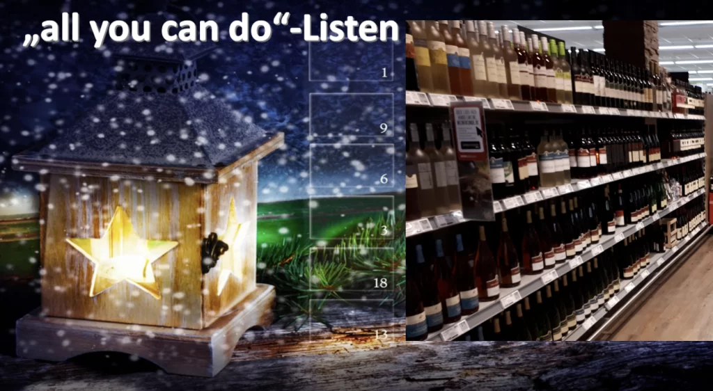 Allerdings hat das Weingeschäft in den letzten Jahren ebenfalls weiter angezogen und gerade in den Tagen vor dem Fest ist der Kunde gerne bereit ein besseres Fläschchen zu kaufen. Also auch in diesen wichtigen Warengruppen gibt es reichlich Chancen auf Mehrumsatz.