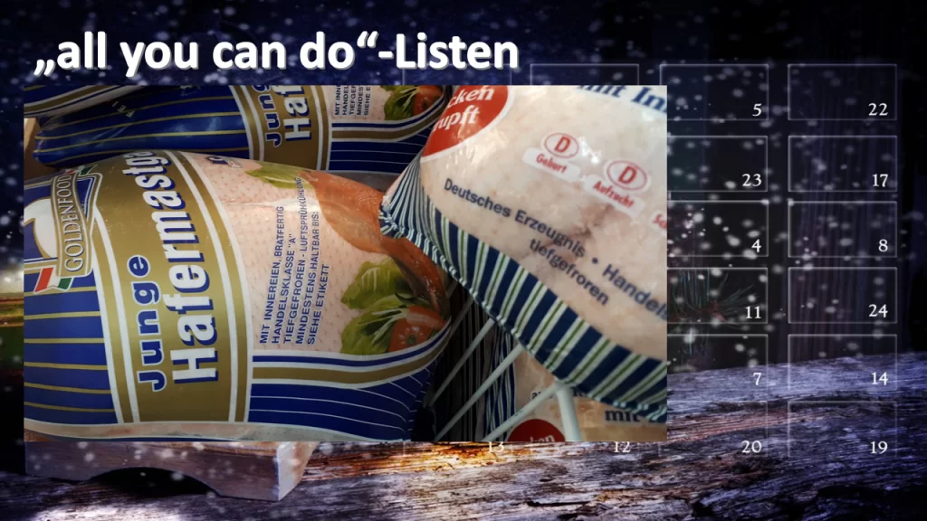 Obendrein hat sich das Frische Großgeflügel trotz knackiger Preise in den letzten Jahren eine starke Position erarbeitet. Immerhin kann man in den letzten Tagen vor dem Fest mit diesen Artikeln sehr gute Umsätze realisieren. Gerade in der heutigen Zeit wo die Themen, Herkunft, Fütterung, Aufzucht, Bio und Regional immer größere Wichtigkeit bekommen, hat das frische Sortiment echte Vorteile. Aber Achtung, die Disposition muss stimmen, am besten organisiert man rechtzeitig Vorbestellungsmöglichkeiten für die Kundschaft. Sichert dem Kunden die Ware und reduziert das Abschriften- Risiko.