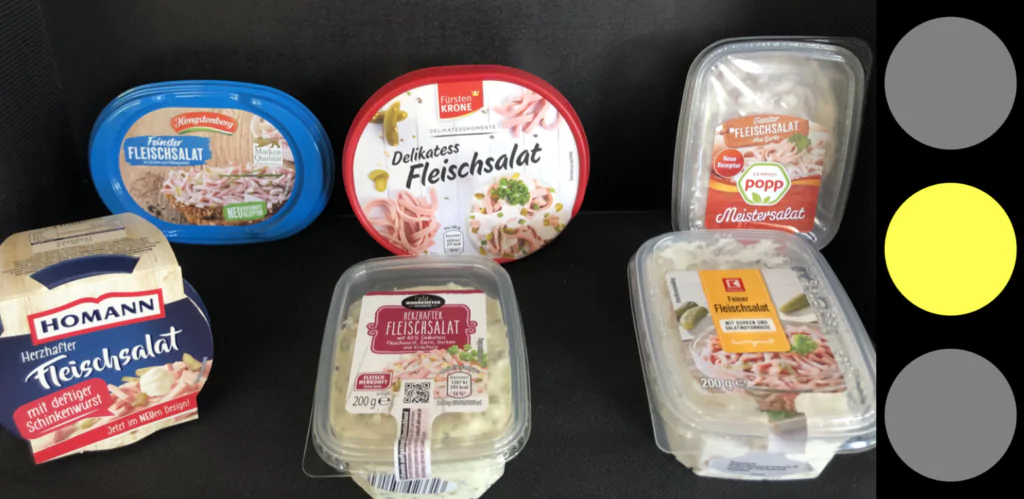 Schon bei der Auswahl der nächsten Test Kategorie war uns Ampel-Foodzies bewusst, dass Fleischsalat kein Zuckerschlecken wird. Drei Marken und drei Handelsmarken haben wir dieses mal in den Test gewählt. Hengstenberg, Homann und Popp stand auf unserer Markenagenda. Aldi Süd, Netto und Kaufland stellte die Riege der Handelsmarken dar. Aber schon beim Einkaufen fiel auf, dass es Unterschiede geben wird. Aldi stellte einen Sortimentskarton ins Regal, leider war aber der normale Fleischsalat ausverkauft, dafür gab es bestimmt 15 Schalen mit Kräuter. Netto bot nur 400 Gramm an, alle anderen begnügten sich mit 200. Der deklarierte Wurstanteil schwankte zwischen 45% bei Popp, Netto war die Wurst zu teuer und lies nur 34% davon in seine Schale packen. Dafür war Netto mit 25 Cent pro 100 Gramm der Günstigste. Hengstenberg erstanden wir hingegen zum dreifachen 100 Gramm Preis. Nun konnte die Quälerei losgehen.