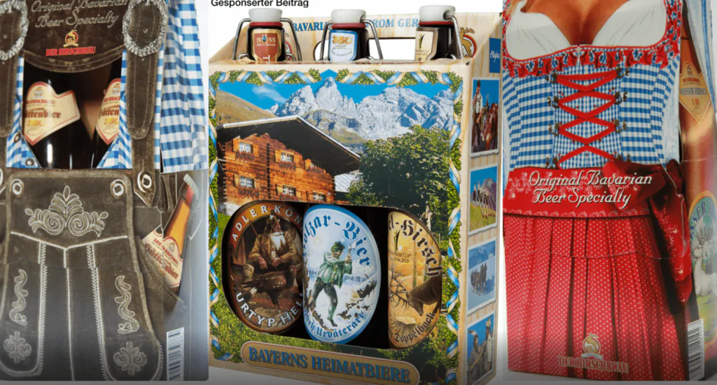 Dazu können sich die beliebten Biere als hochwertig bayerisch anmutende Geschenkartikel präsentieren. Wie z.b. die beliebten 3er und 4er Träger, 2er Dirndl- und Lederhosen-Sets, witzigen Lederhosenträgern, 6er Hirsch-Tascherl – u.a. auch präsentiert in dekorativen und Impuls-starken Displays.