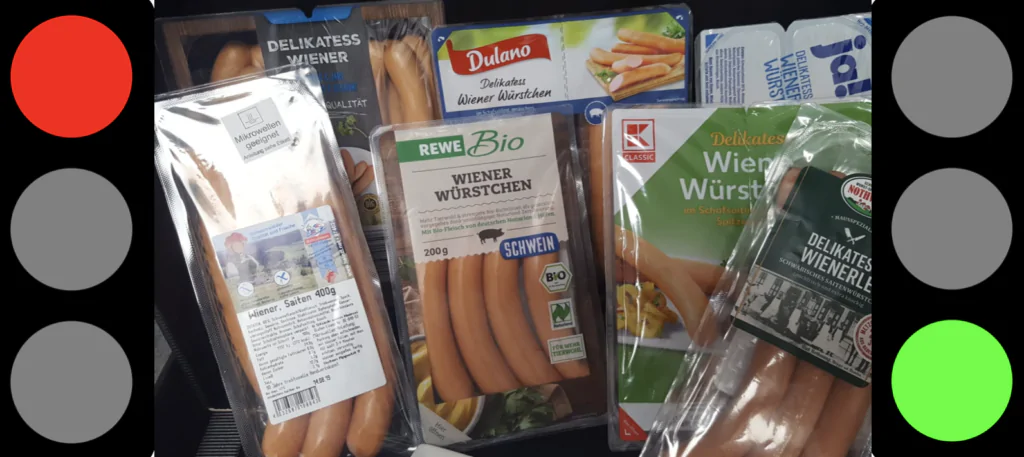 Leicht abgeschlagen, aber auch noch GRÜN waren Heinzelmann, Rewes Bio und Aldis Schmälzle Wiener. Nur GELB schaffte dieses Mal Lidl mit seiner Dulano.
