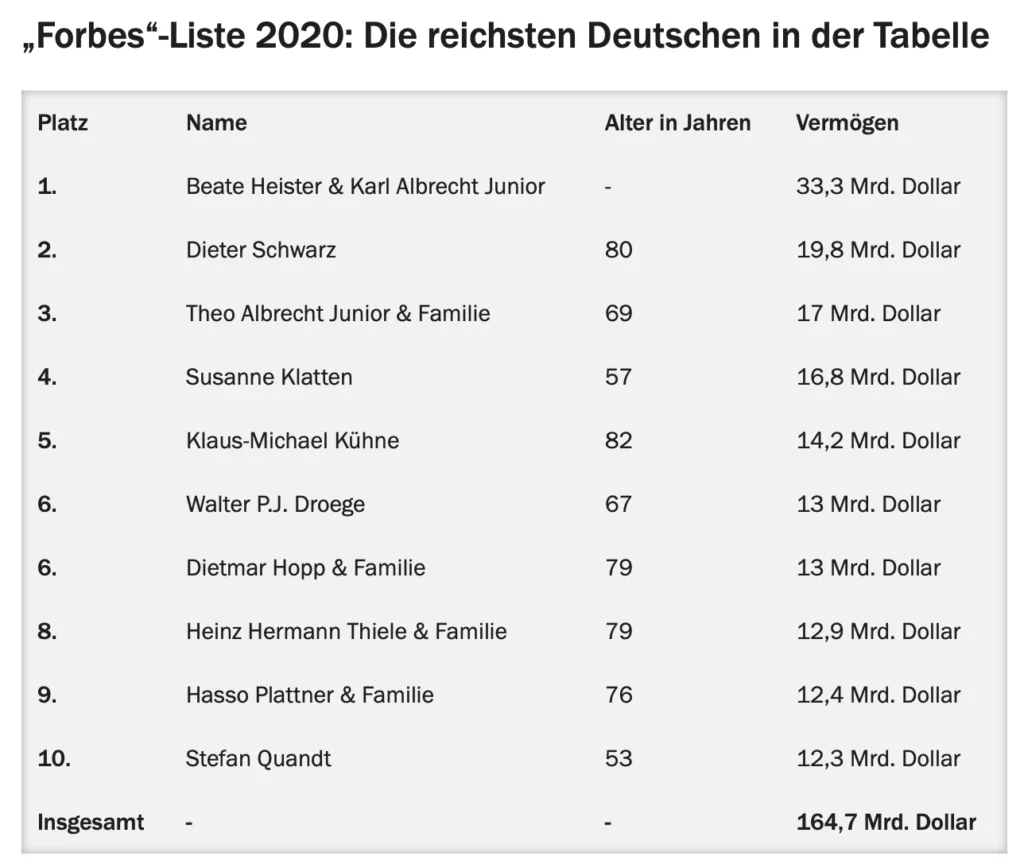 Hier nun die aktuellsten Ergebnisse aus der Forbes-Liste 2020