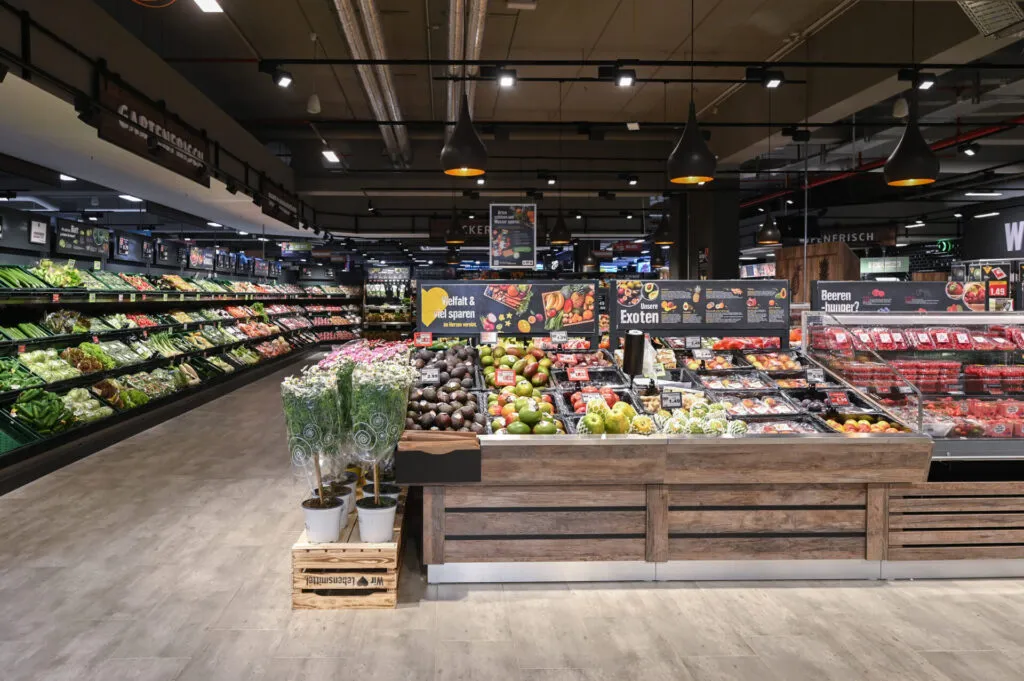 Auch in Sachen Klimaschutz und Nachhaltigkeit ist der neue Vollsortimenter vorbildlich, z. B. durch den Einsatz von 100 Prozent Ökostrom, den Verzicht auf fossile Brennstoffe und die Nutzung von Tageslicht. Die Kühlmöbel arbeiten mit dem natürlichen Kältemittel CO2 und werden zur konstanteren Temperaturführung mit Glastüren verschlossen. Beheizt wird der Markt mit der Abwärme der Kälteanlagen und einer Wärmepumpe.