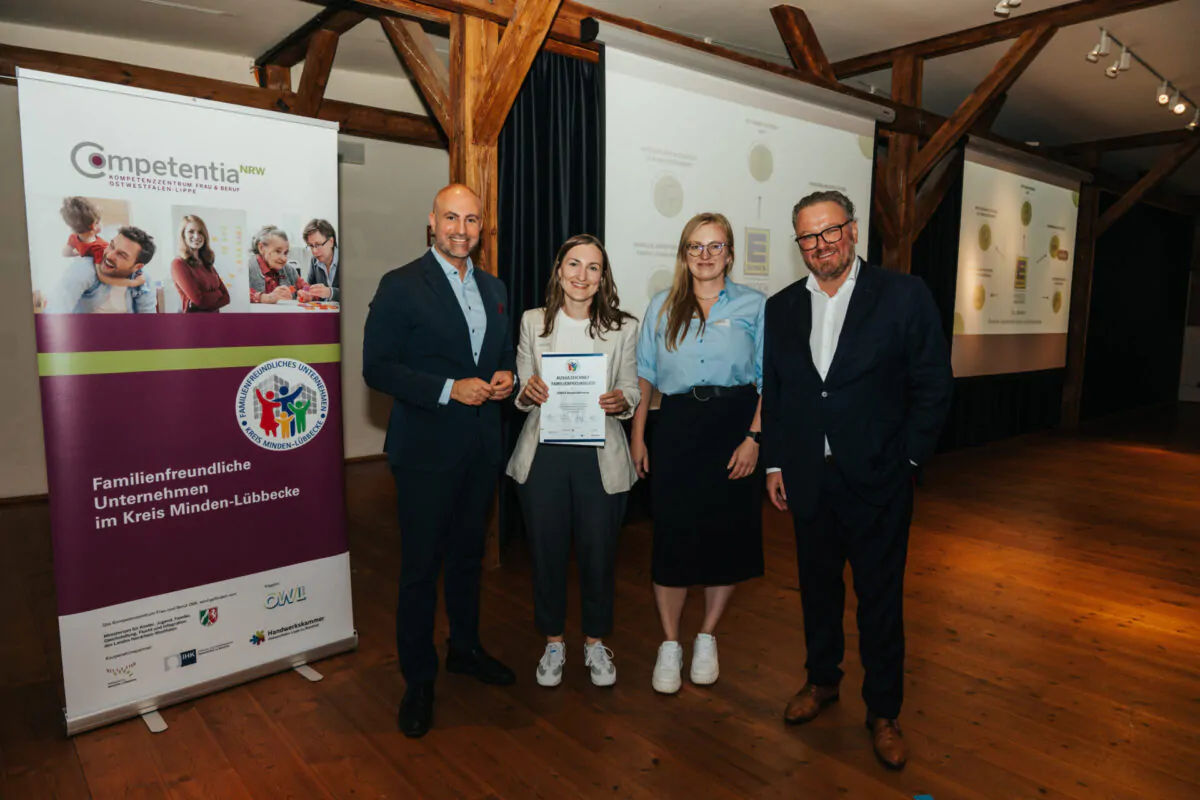 Bereits zum sechsten Mal in Folge erhält die EDEKA Minden-Hannover die Auszeichnung „Familienfreundliches Unternehmen im Kreis Minden-Lübbecke“. Bei der feierlichen Urkundenverleihung im LWL-Preußenmuseum in Minden überreichten Landrat Ali Doğan und Björn Böcker (Geschäftsführer der OstWestfalenLippe GmbH) gemeinsam die Urkunde an Kristina Vahrenkamp und Katharina Bolte aus der Personalentwicklung der EDEKA Minden-Hannover.