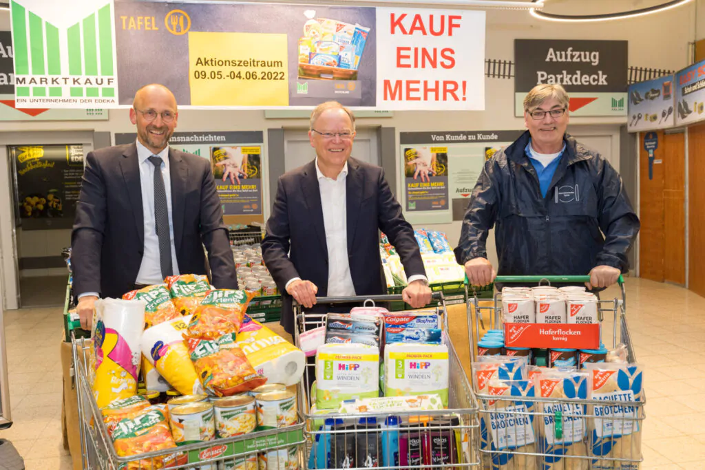 Um die lokalen Tafeln und damit auch bedürftige Menschen in den aktuell wirtschaftlich besonders schwierigen Zeiten zu unterstützen, startete im gesamten Absatzgebiet der EDEKA Minden-Hannover vor drei Wochen die Spendenaktion „Kauf eins mehr“. Unter Beteiligung aller EDEKA-Märkte, der EDEKA Center sowie MARKTKAUF und NP läuft die Aktion noch bis zum 4. Juni. Heute besuchte Stephan Weil, Ministerpräsident von Niedersachsen und gleichzeitig Schirmherr des Landesverbandes der Tafeln in Niedersachsen und Bremen, den MARKTKAUF Hannover, um sich über die Zusammenarbeit zwischen der EDEKA Minden-Hannover und den Tafeln zu informieren und sich ein Bild von der Spendenaktion zu machen.