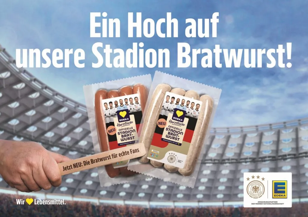 Seit April ist EDEKA offizieller Ernährungspartner der Männer-Nationalmannschaft des Deutschen Fußball-Bundes (DFB). Zum Start der Partnerschaft bringen EDEKA und der DFB das Stadionfeeling direkt in die heimische Küche – oder auf den Grill: Pünktlich zur Grill-Saison und dem Länderspiel mit Beteiligung der deutschen Männer-Nationalmannschaft in München ist die “EDEKA Herzstücke Offizielle Stadion Bratwurst” in zwei Sorten ab sofort in teilnehmenden EDEKA-Märkten erhältlich. Aktivierende Maßnahmen in den Märkten, online oder in verschiedenen Austragungsstätten begleiten den Launch des neuen Lizenzprodukts.