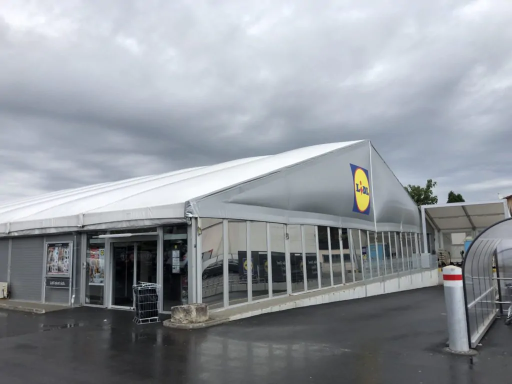 Das ca. 1000 qm große Lidl-Festzelt (wurde offensichtlich dem Oktoberfest in München entrissen) lässt für die Kunden fast keine Wünsche offen. Die Discountmanager haben die komplette Lidl-Handelsleistung auch in diesem Zelt untergebracht. Wie im Festbau begrüßt eine transparente Zeltfassade die Kunden, des Weiteren ist die Leergutannahme mit Automaten im Eingangsbereich klassisch organisiert. Der große Backshop liegt an der gleichen Stelle mit gleicher Ausstattung wie in einem normalen Lidl-Markt. Ebenso der gesamte Frische- und Tikobereich mit den üppigen Kühlungen macht keine Unterschiede im Provisorium. Die gesamte Platzierung des Food und Non-Food Sortiments sowie die Checkoutzone mit vier Kassen macht überhaupt keinen provisorischen Eindruck.