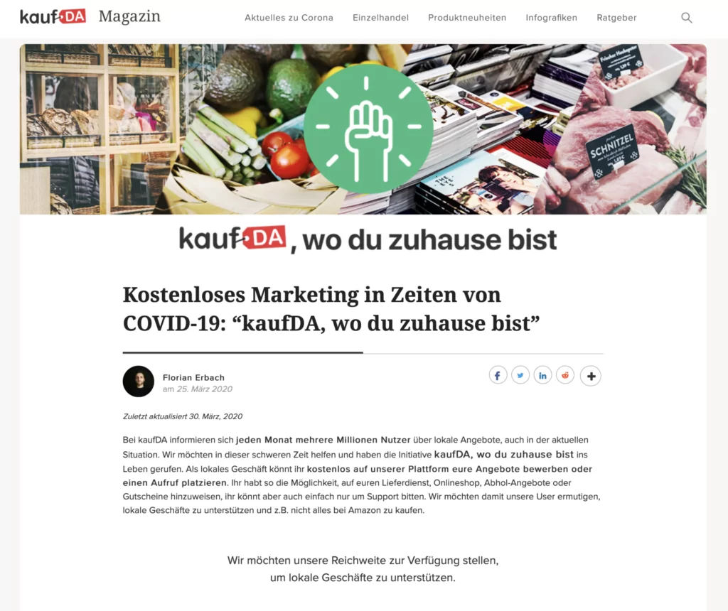 Daher startet Deutschlands reichweitenstärkste Shopper-Plattform kaufDA eine einzigartige und bundesweit einmalige Aktion: Unter dem Motto „kaufDA, wo du zuhause bist“ können alle Geschäfte und Läden den Service von kaufDA kostenlos nutzen, um während der Corona-Krise weiterhin auf Angebote, Produkte oder Dienstleistungen aufmerksam zu machen oder gezielt Aufrufe oder Aktionen zu platzieren – sei es ein neu eingerichteter Lieferdienst, der eigene Onlineshop, Take-Out-Angebote, Gutscheine oder einfach nur die Bitte um Unterstützung. Die Inhalte werden auf kaufDA wie gewohnt lokal und standortbasiert ausgespielt, um die Nutzer in der Nähe zu erreichen.