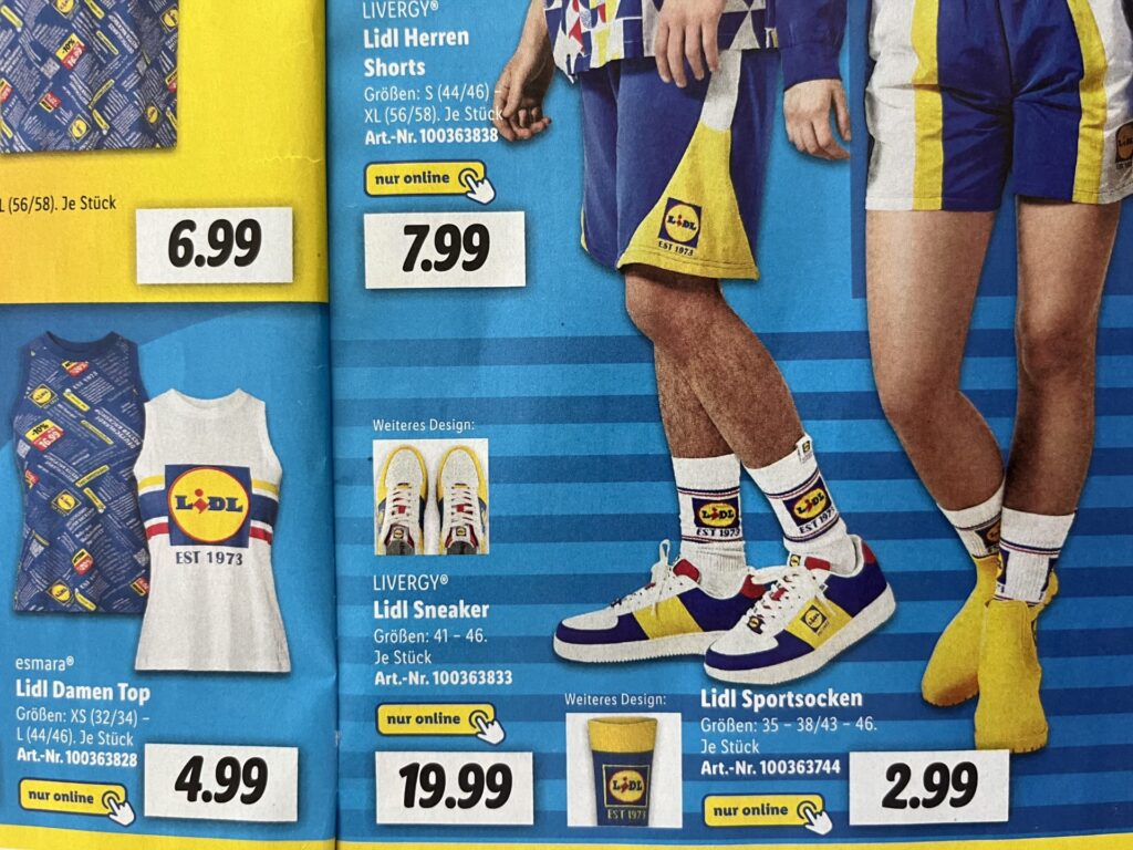 Aber nun hat sich der Discounter seit einigen Tagen wirklich etwas Besonderes ausgedacht. Zum 50. Geburtstag von Lidl hat das Unternehmen eine eigene Textilkollektion entworfen. In den bekannten Lidl-Farben blau, rot und gelb erschienen am 5. Juni unter anderem bunte Tracksuits (Trainingsanzüge), Tops, Hemden, Shorts, Bauchtaschen und Schuhe. Diese sind bisher ausschließlich im Onlineshop erhältlich. Außerdem kehren Retro-Produkte aus den 70er, 80er und 90er Jahren als Sonderangebote in die Filialen zurück. Ein echter Volltreffer für den Discounter, auch wenn leider schon nach dem ersten Ansturm viele Kleidungsstücke bereits am nächsten Tag ausverkauft waren. Die Aktion war eigentlich als einmaliges und limitiertes Angebot gedacht. Ob eine Wiederauflage kommt, steht noch nicht fest, jedoch sollen nun wieder einige Artikel lieferbar sein.