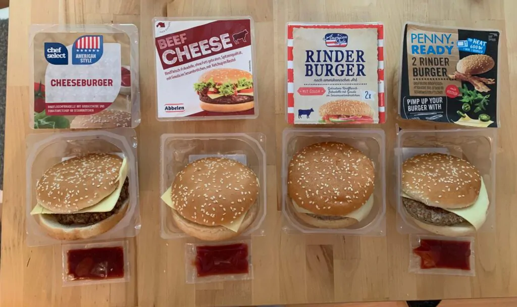 Erst einmal ein paar ganz allgemeine Informationen zu den Burgern. Wir haben uns für den Rinder-Cheese-Burger entschieden. Bei allen Händlern waren zwei Burger á 150g in der Verpackung. Lidl, Aldi und Penny haben noch 2 Packungen Ketchup á 10g dazugelegt. Netto hat darauf verzichtet und bietet deshalb den Burger mit 1,89 € günstiger an als die Konkurrenten mit 1,99 €.