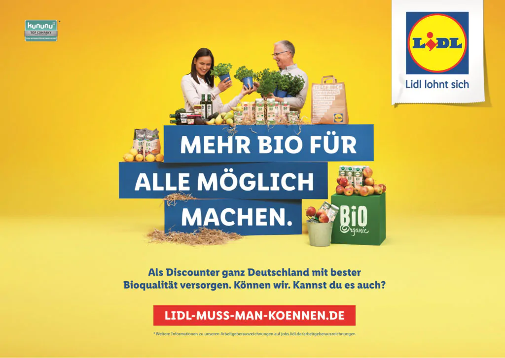 oder “Mehr Bio für alle möglich machen” auf die verschiedenen Tätigkeitsfelder und Themen im Unternehmen an. Darüber hinaus wird die neue Kampagnenseite https://lidl-muss-man-koennen.de gelauncht. Erstmalig setzt ein Discounter bei seinem Employer Branding allerdings auch auf TV: Ab 31. August werden an zwei aufeinanderfolgenden Wochenenden Fernsehspots mit den Inhalten der neuen Lidl-Arbeitgeberkampagne ausgestrahlt.