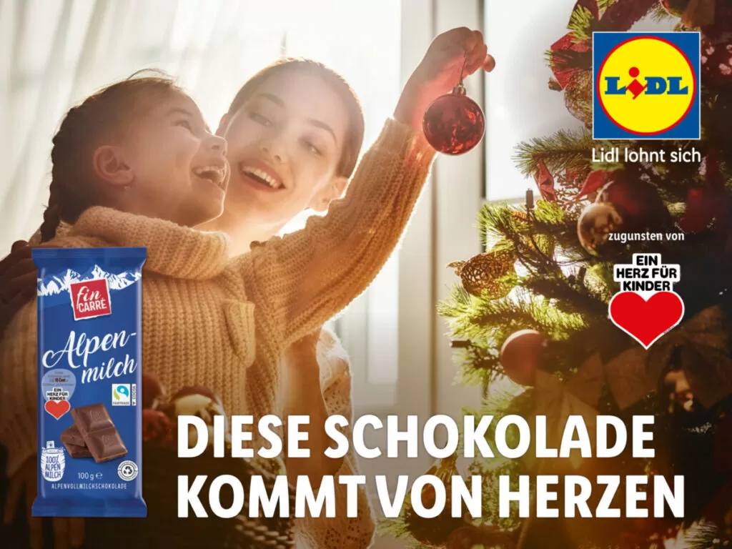 Lidl-Kunden können ab Montag, 31. Oktober, in allen rund 3.200 Filialen mit dem Kauf der “Fin Carré”-Alpenvollmilchschokolade etwas Gutes tun. Lidl spendet pro verkaufter Tafelschokolade mit dem “Ein Herz für Kinder”-Logo 10 Cent an die Kinderhilfsorganisation BILD hilft e.V. “Ein Herz für Kinder”. Damit fördert der Lebensmitteleinzelhändler die Chancengerechtigkeit sowie deutschland- und weltweit Projekte für in Not geratene Kinder und Familien. Seit 2007 ist die Spendenaktion zugunsten “Ein Herz für Kinder” ein wichtiger Bestandteil des gesellschaftlichen Engagements von Lidl.