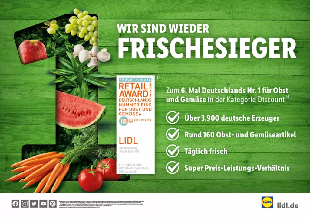Diesen erneuten Erfolg feiert Lidl in den kommenden Wochen unter anderem in TV- und Radio-Spots. Ebenfalls bewirbt das Unternehmen seinen Frischesieg im Haushaltshandzettel, in den Filialen und klassisch in Zeitungsanzeigen.
