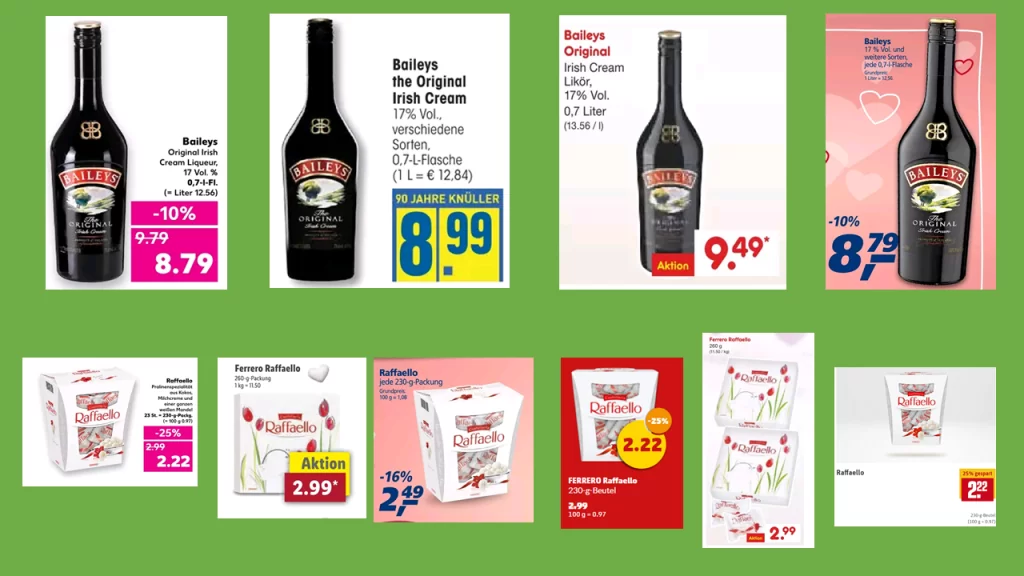 Raffaello und Baileys sind die meist beworbenen Artikel in dieser Woche zum Muttertag. Fast alle Handelsketten hatten diese „Idee“.