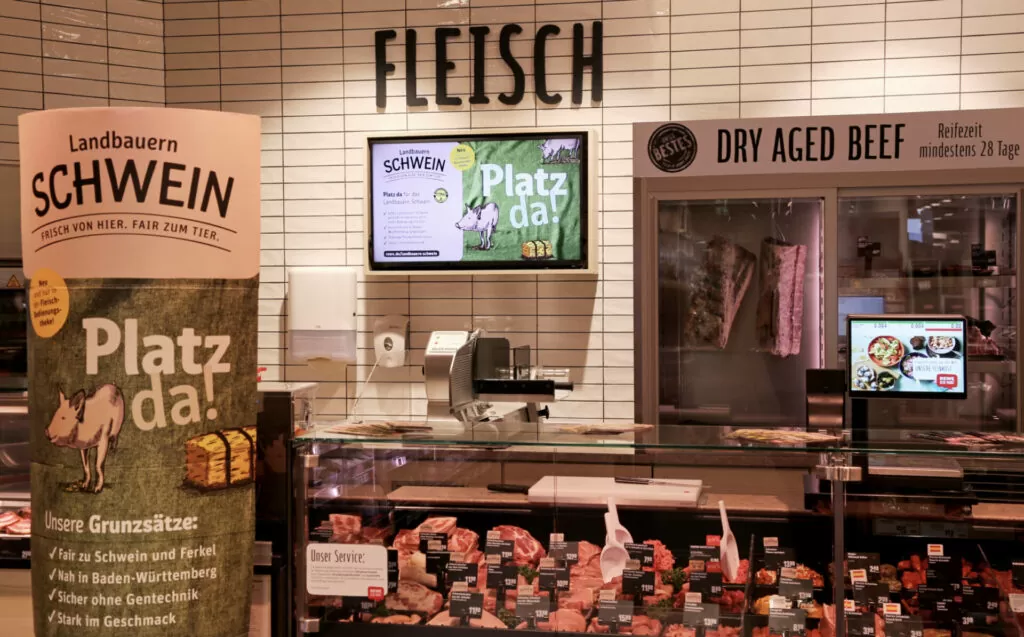 Was jedoch an 13 Bedienungstheken im Großraum Stuttgart als Test im März 2020 begann, ist heute – zwei Jahre später – ein wichtiger Sortimentsbaustein. Das Landbauern Schweinefleisch ist in über 70 Märkten an den Bedientheken und in über 80 Märkten im Kühlregal zu finden. Die Eigenmarke „Landbauern“ gibt es ausschließlich in REWE Märkten in Südwestdeutschland und wurde 2022 durch „Landbauern Rind und Kalb aus dem Haus Qualivo“ sowie „Landbauern Hähnchen“ erweitert.