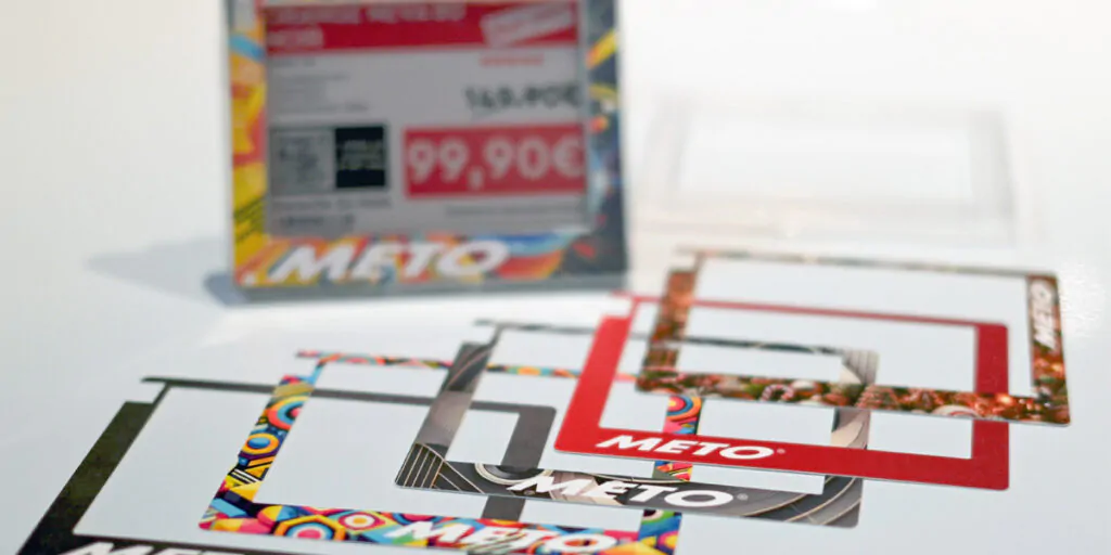 Meto ist Vorreiter für ESL-Befestigungslösungen. Ingolf Schulten selbst setzt seit vielen Jahren Projekte in diesem Bereich um. „Vor Ort im Gespräch mit Einzelhändlern kam immer wieder die Frage auf, ob wir nicht eine schnelle Lösung für Kleinstmengen entwickeln können, um bestimmte Artikel oder Aktionen kurzfristig zu pushen“, beschreibt der Produktmanager den Entstehungsprozess der SnapOn Inlays. „Wir haben dann überlegt, wie können wir schneller liefern und die SnapOns insgesamt flexibler gestalten?“ Die Lösung ist die transparente Produktion der eigentlichen SnapOns, in Kombination mit dem bedruckbaren Einlegeblatt aus robustem PET-Kunststoff. Durch diese Aufteilung beträgt die Produktions- und Lieferzeit rund acht Tage. Denn die SnapOnInlays können digital in Deutschland gedruckt werden. Die transparenten Rahmen sind auf Lager und damit ebenfalls schnell verfügbar. Beim klassischen SnapOn wird der Kunststoffrahmen in einer Auflage ab 500 Stück individuell bedruckt.
